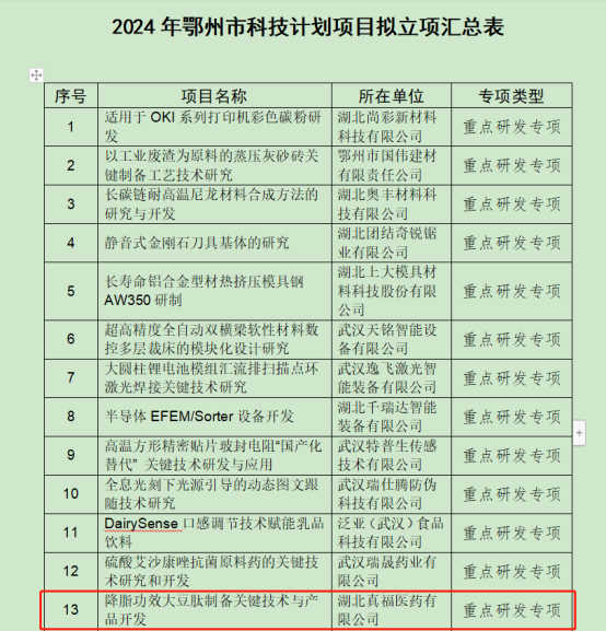 近日,鄂州市科学技术局正式发布了《2024年鄂州市科技计划项目拟立项项目公示》。我司以自主研发的“降脂功效大豆肽制备关键技术与产品开发”项目荣获重点研发专项。